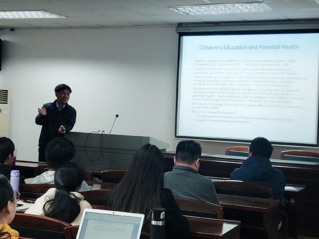 2019年12月11日下午16:15,由经济管理研究中心主办的第74期学术研讨会在湖南大学北校区行政楼401如期举行。此次研讨会的主题为“Children’s Education and Parental Health: Evidence from China”,主讲人为刘智强教授。
