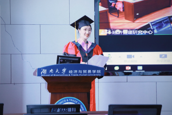 At 15:00 in the afternoon, the 2021 graduates, three representatives of the 2020 graduates, all faculty and staff participated in the degree award ceremony of the CEFMS. The host Professor Yaqin Su, secretary Professor Hu Zongyi, and all the full-time professors take turns to give speech to the graduates. The visiting professors who were unable to attend the graduation ceremony due to the epidemic also expressed their pride in the achievements of the graduates. They encouraged the students to learn to care for themselves and calmly deal with various challenges in life and work. Later, the representatives of the doctoral graduates and the master’s graduates spoke successively, expressing their gratitude to the teachers of CEFMS, classmates and friends. During their studies at CEFMS, the graduates have improved their academic aptitude and cognitive ability, cultivated the ability of solving difficult problems, gained growth and friendship. Finally, Professor Haizheng Li made a concluding remark, congratulating the graduates on successfully completing their studies, and wishing everyone to find simple happiness and embrace the world in a world full of uncertainties. The degree-granting ceremony officially started at 16:00 pm. Professor Haizheng Li issued graduation certificates and took photos with the graduates.